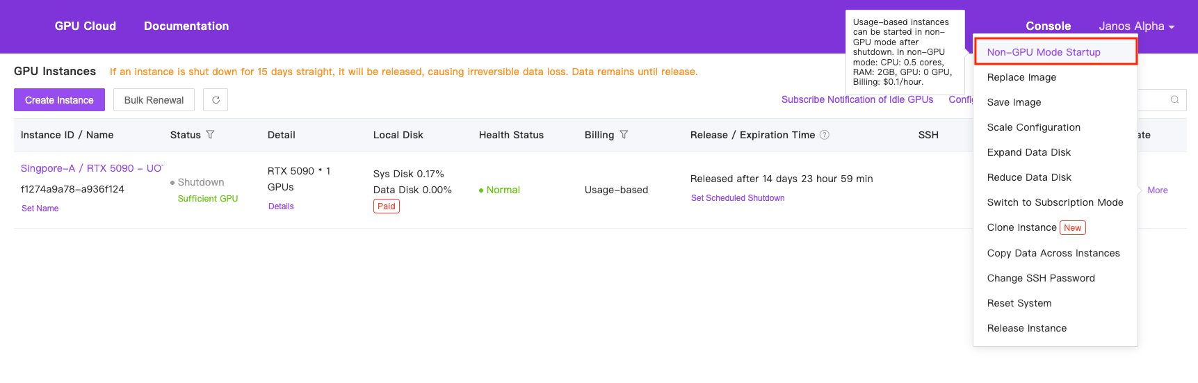 For tasks that don’t require a GPU, such as coding, debugging, or data transfer, you can shut down and restart in “no-GPU mode.” This mode uses 0.5 CPU cores, 2GB memory, and no GPU, costing $0.1/hour. Data remains unaffected, and you can switch back to normal mode later.
