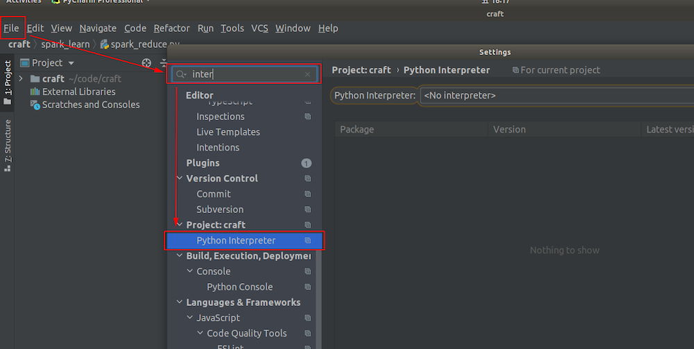 Go to File -> Settings to open the settings dialog, then search for “interpreter” to find the Python interpreter setting option.