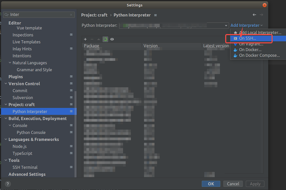 Click on “Add Interpreter,” select “On SSH” and click (this option is not available in the PyCharm Community version).