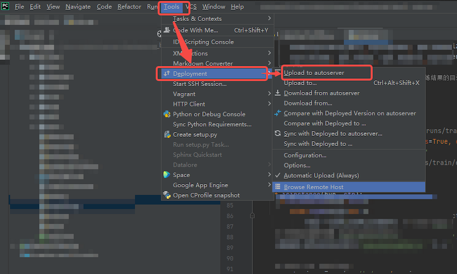 Click “Create” If the configuration is correct, PyCharm will configure for a short while, and you will be able to develop remotely after completion.If you can’t find Python files when running, it might be because the code hasn’t synchronized automatically. You can then choose to synchronize manually: