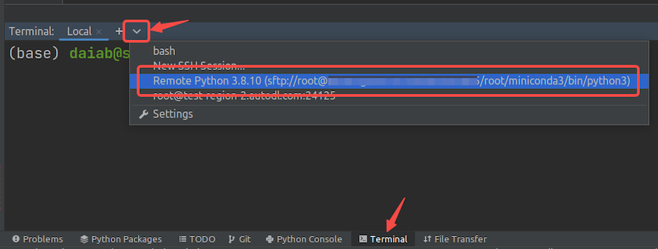 After setting up remote development in PyCharm, you can find and open a remote terminal from the PyCharm terminal dropdown menu by selecting the remote server: