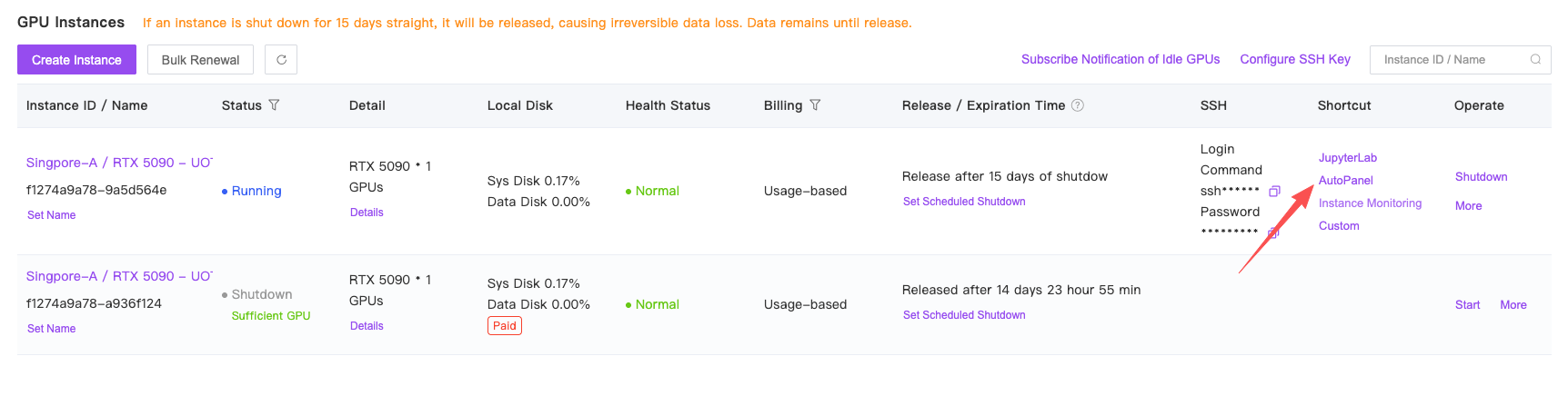 After powering on the instance, locate the access entry for AutoPanel: