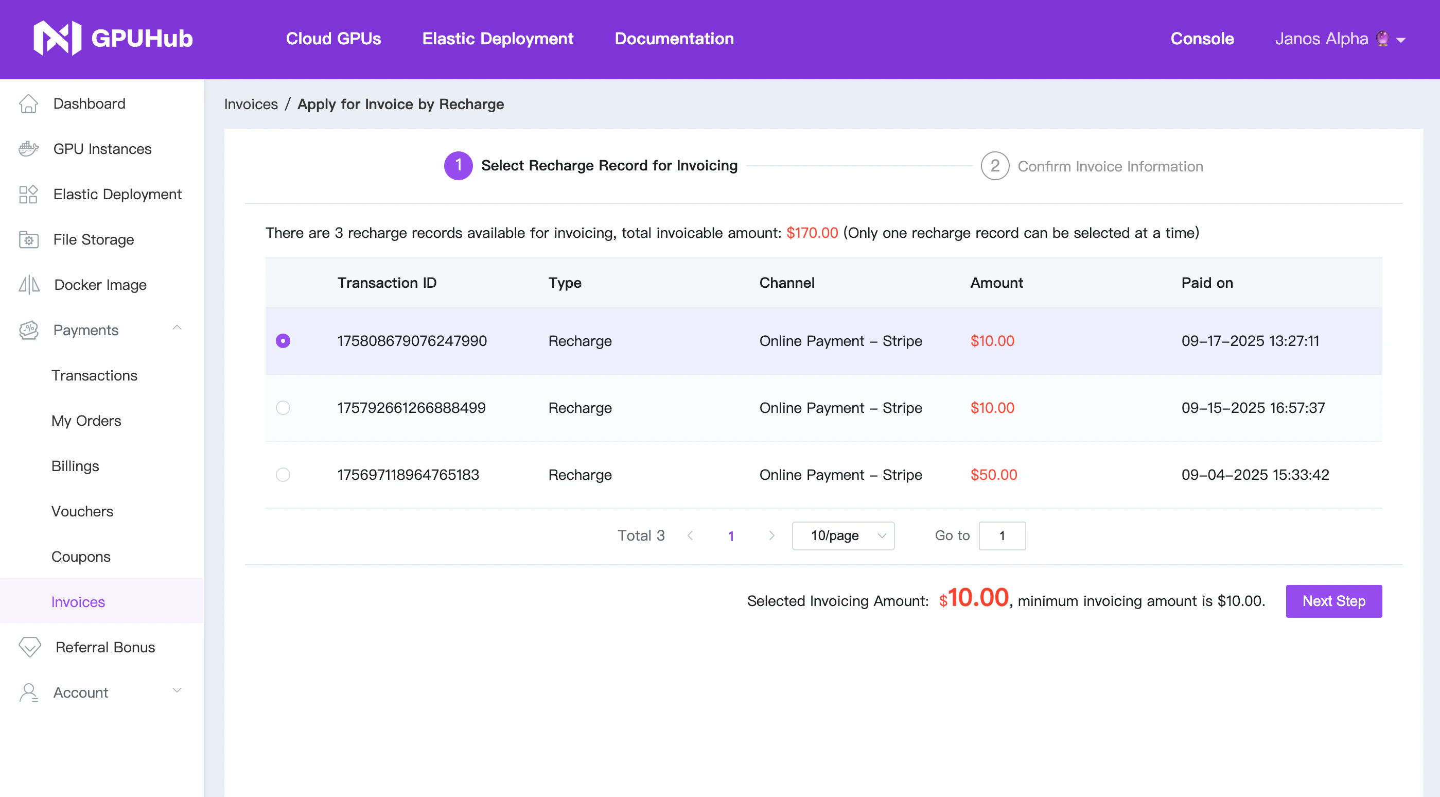 - When invoicing based on recharges, you can issue an invoice immediately after recharging and customize the invoicing amount (with a minimum of USD10 per invoice).