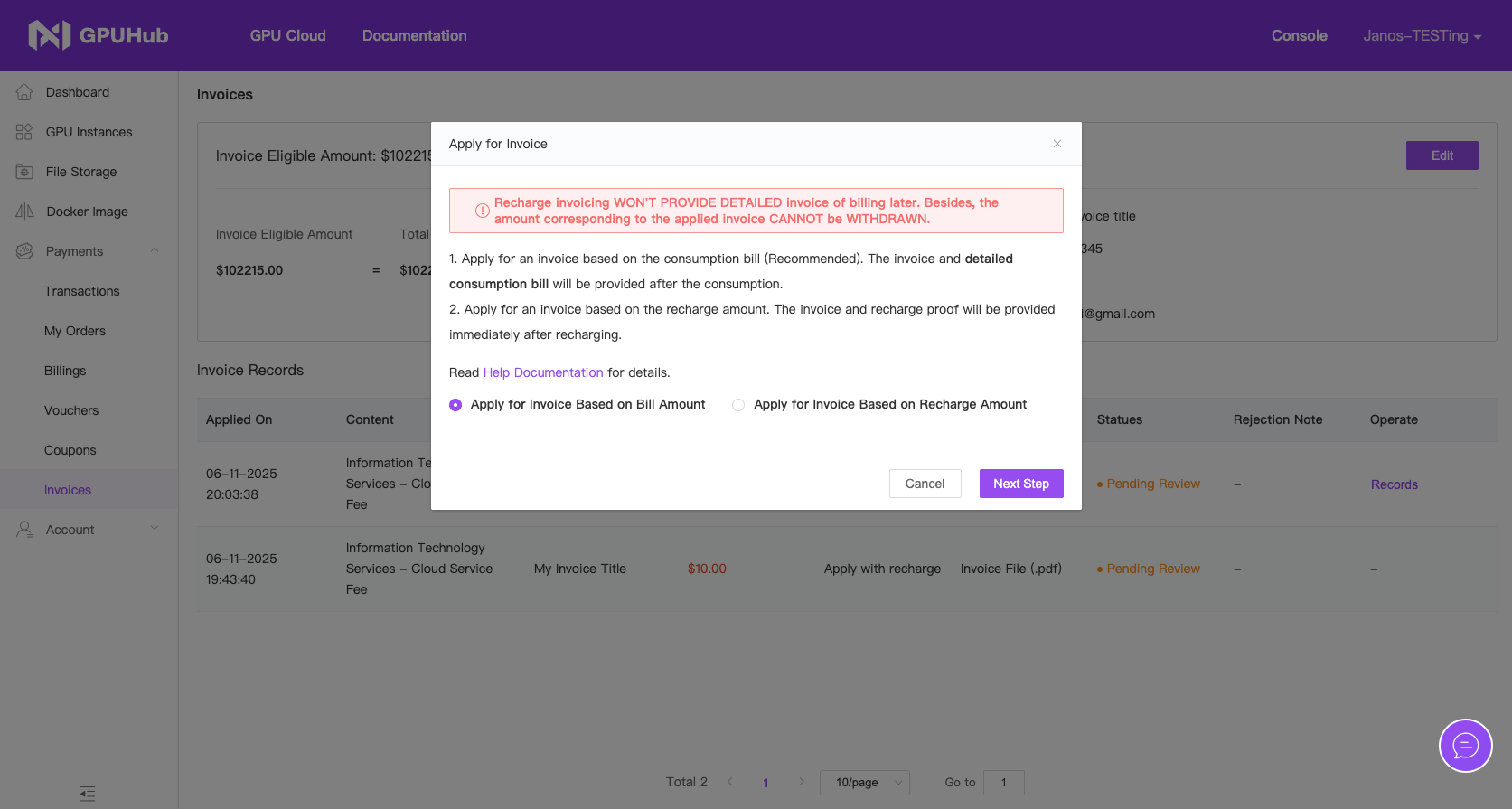 - Different invoicing amount logic. When invoicing based on consumption bills, the invoicing amount is the total amount of the selected consumption bills and cannot be freely adjusted. When invoicing based on recharges, you can issue an invoice immediately after recharging and customize the invoicing amount (with a minimum of USD10 per invoice).