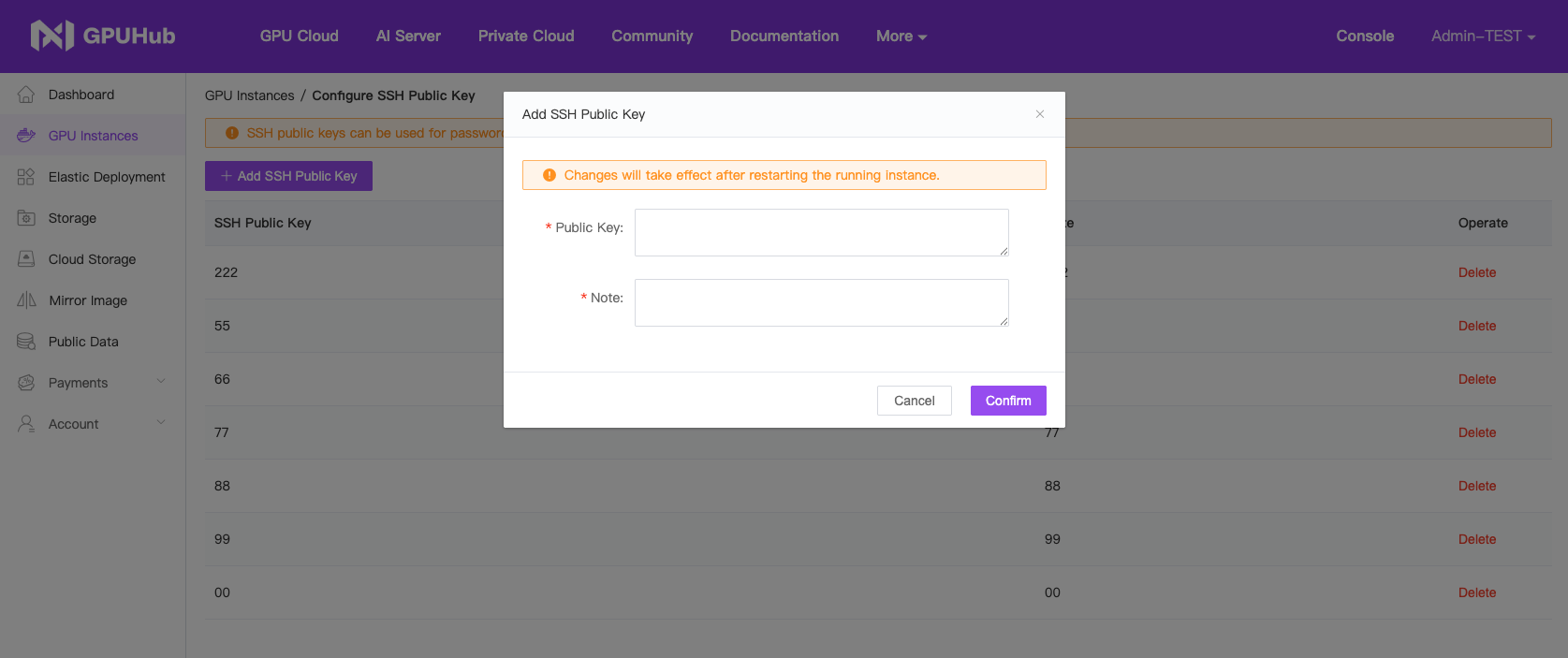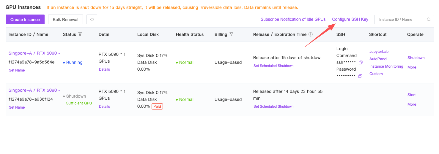 Access the SSH key login settings from Console -> Instances to set up your public key for password-free login. For key generation instructions, see the provided link: 4.3 Git on the Server - Generating Your SSH Public Key