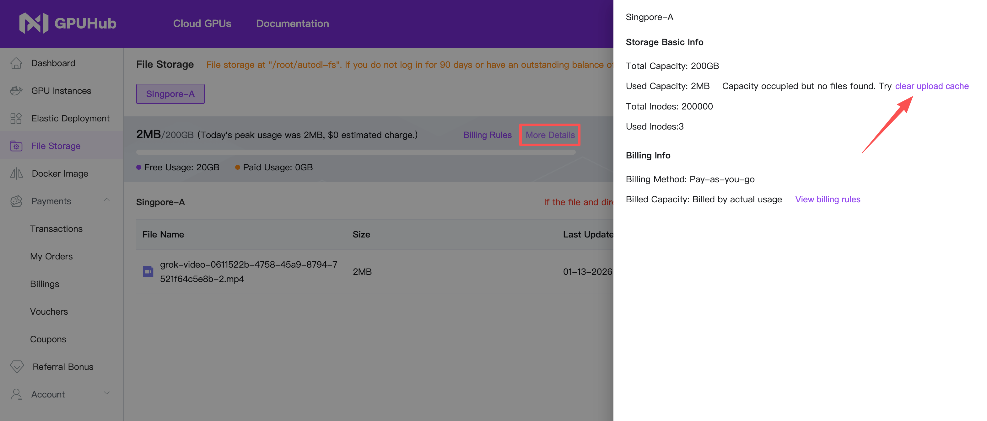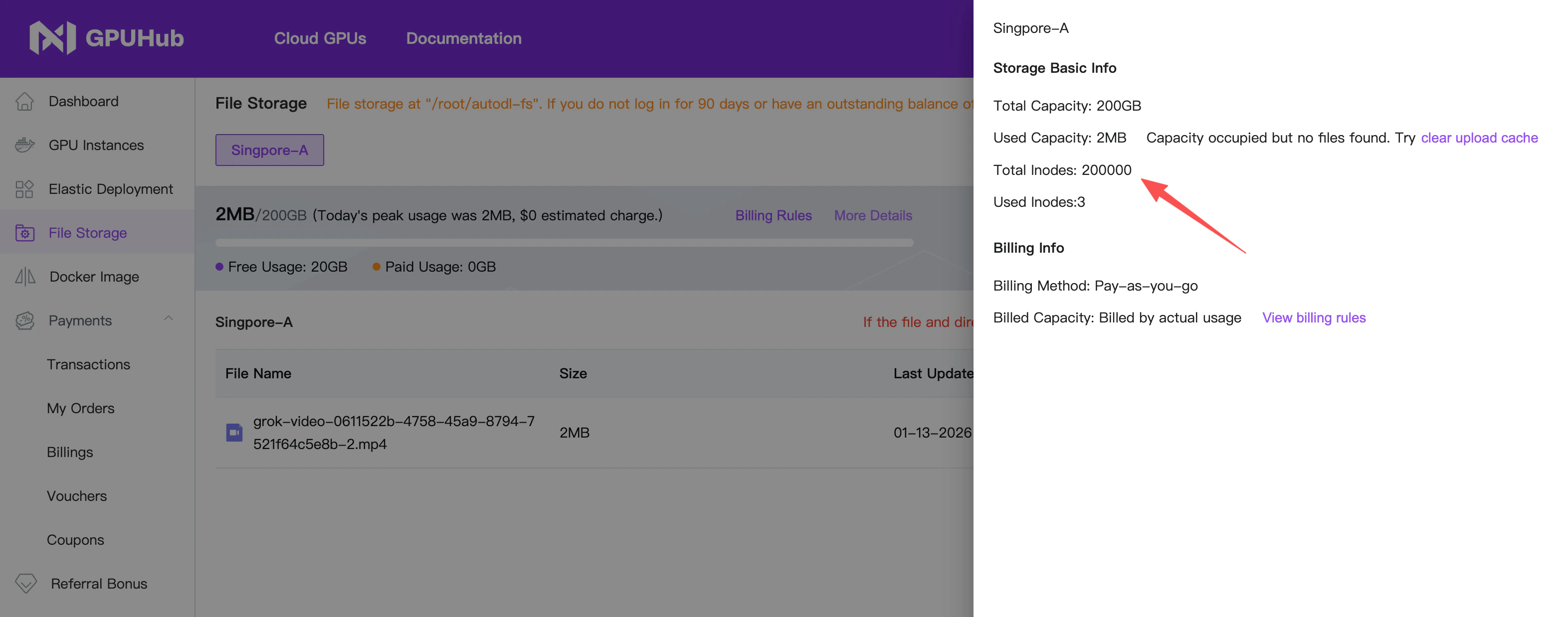 File storage has an inode limit of 200,000. Since a large number of small files significantly impacts read/write performance, we recommend compressing files before storing them in file storage, and keeping small files on the data disk instead. You can monitor your inode usage at any time in: File Storage → More Details.