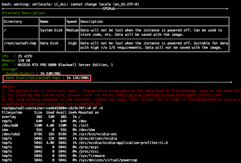 When renting an instance, a data disk of 50-100 GB is provided for free. If you need to expand the disk, select a host that supports the required capacity during rental.