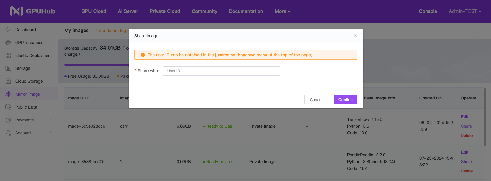 After saving an image, you can click “Share” in the actions menu to share it with specific users.