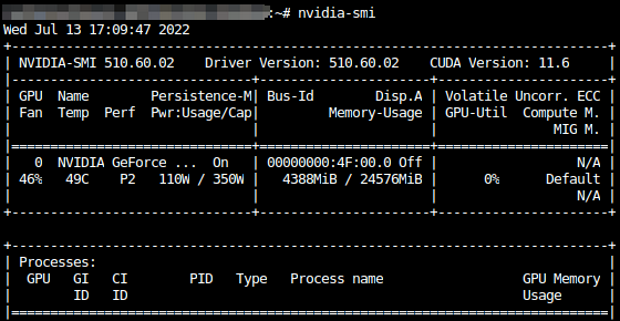 nvidia-smi command to check the GPU usage. If you find that the program has already terminated but there is still GPU memory occupied, it indicates that a residual process is holding the memory. You can release it as follows: