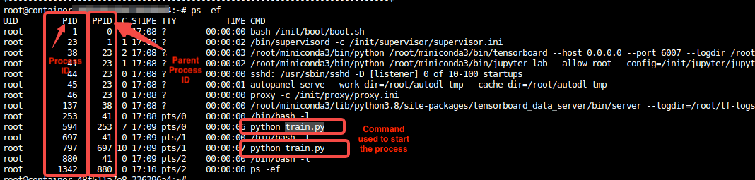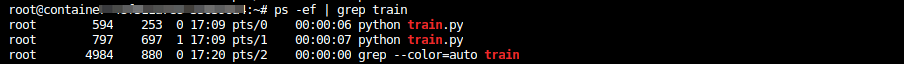 -ef, you can see that all my processes contain the keywordtrain(and other unrelated system processes do not, to avoid accidental termination). You can filter your processes using thegrepcommand, for example: