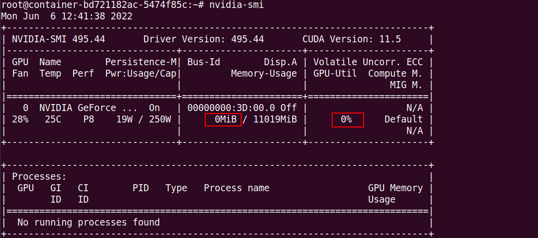 The red boxes marked below indicate the GPU memory usage and GPU utilization rate, respectively.