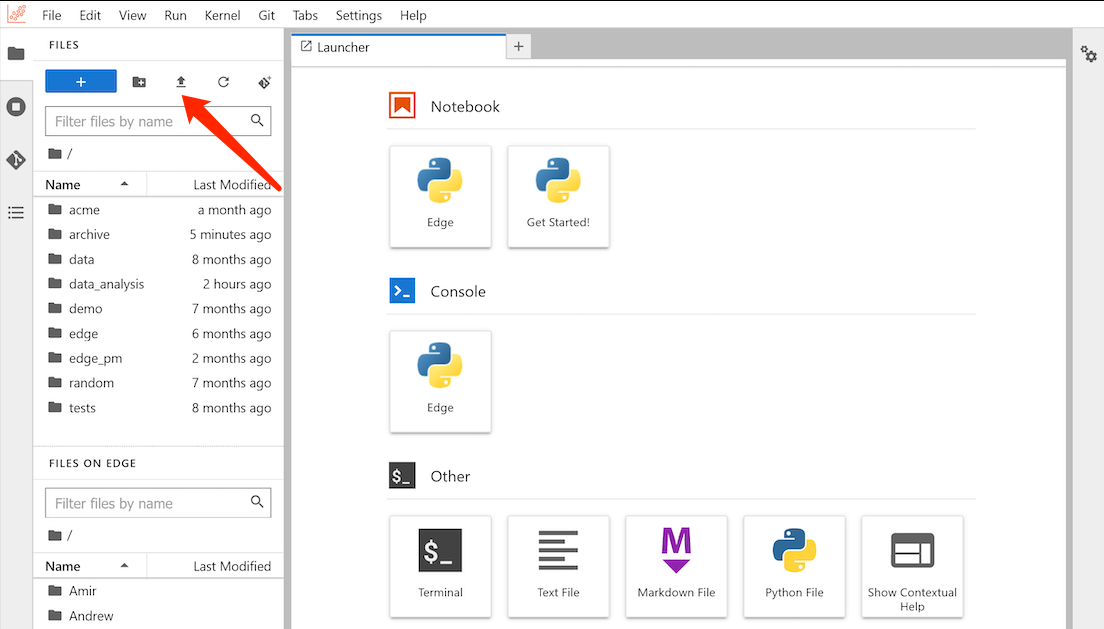 Once the instance is running, find the “JupyterLab” shortcut tool and click to open it. Locate the upload button in the screenshot to upload data. For folder uploads or advanced methods, refer to the Data Upload documentation.