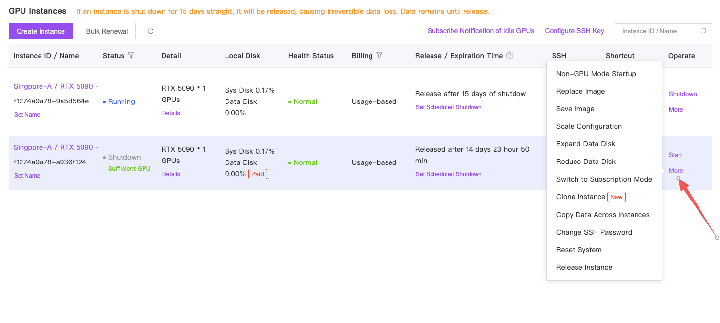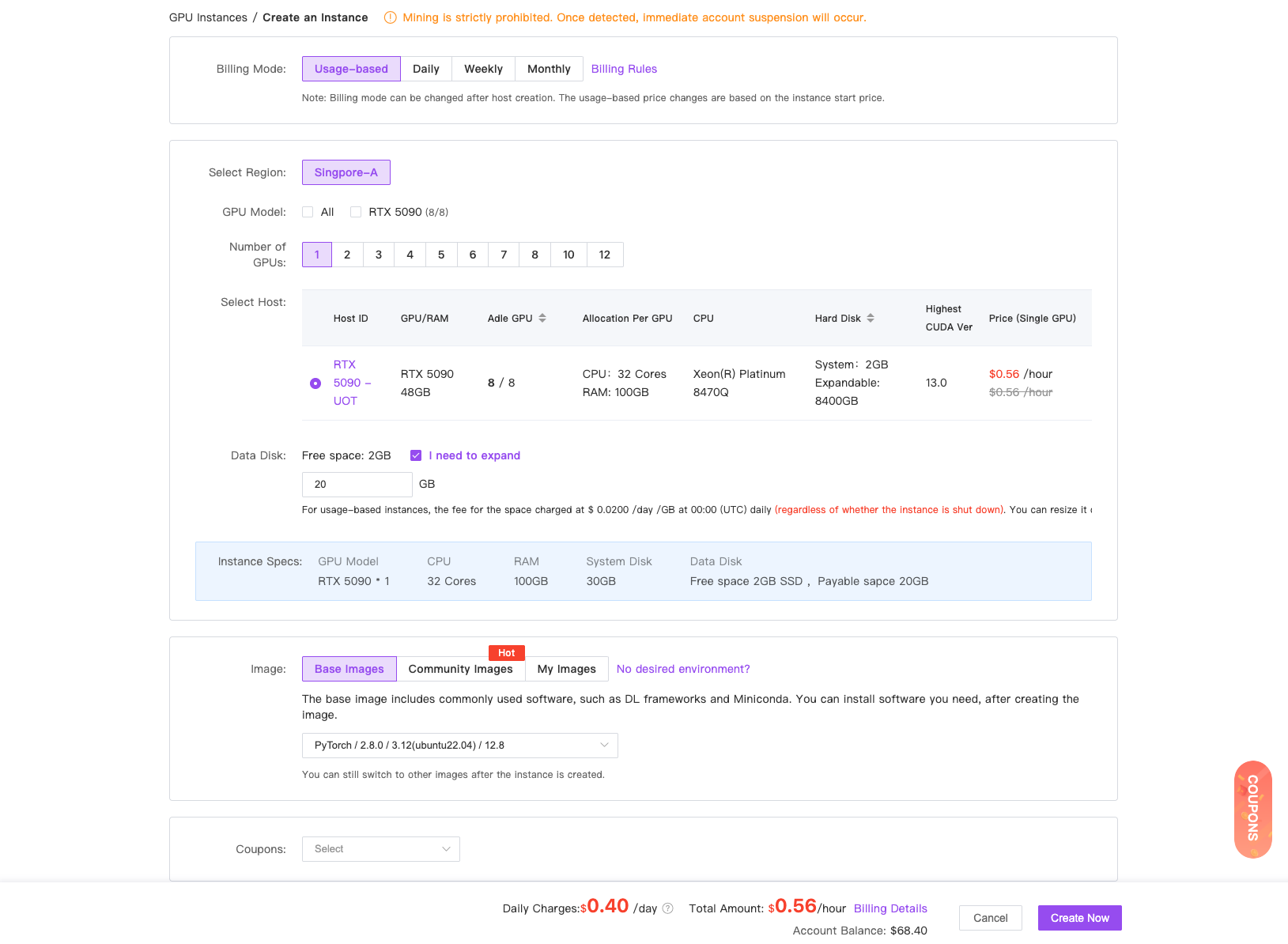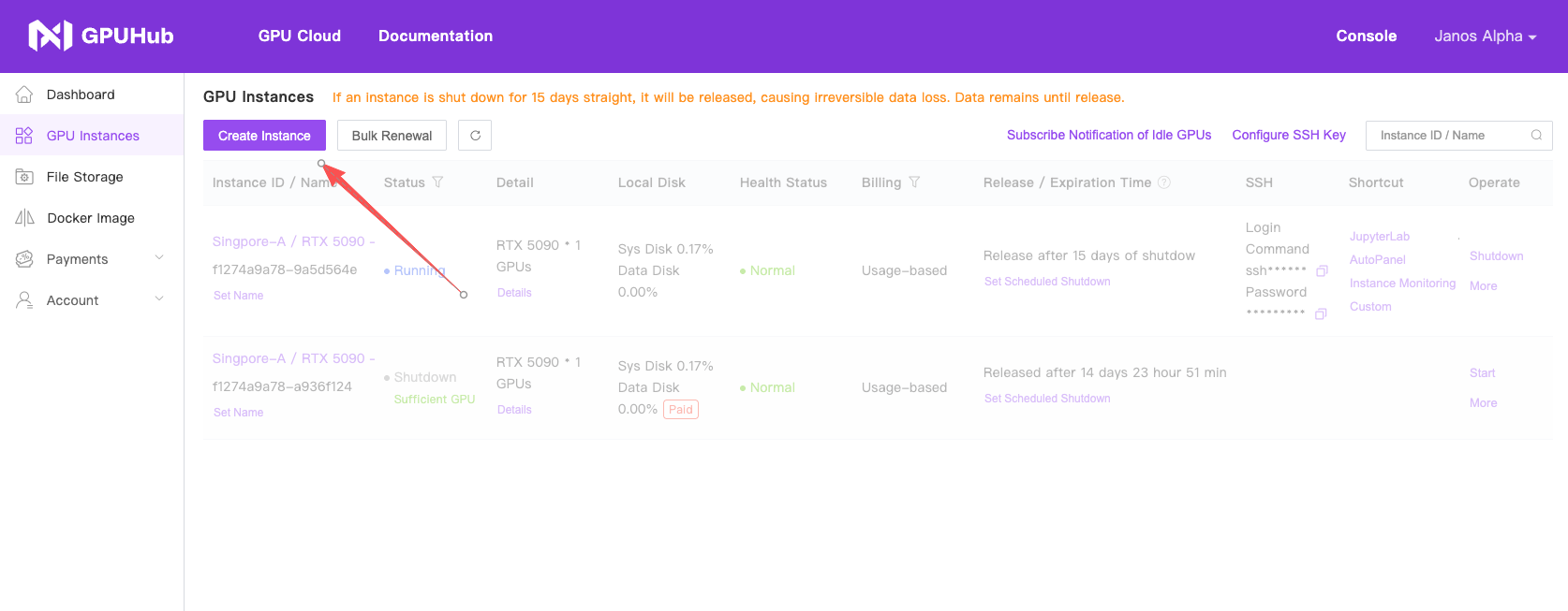 After registration, enter the console. Under My Instances, click “Launch Instance”.