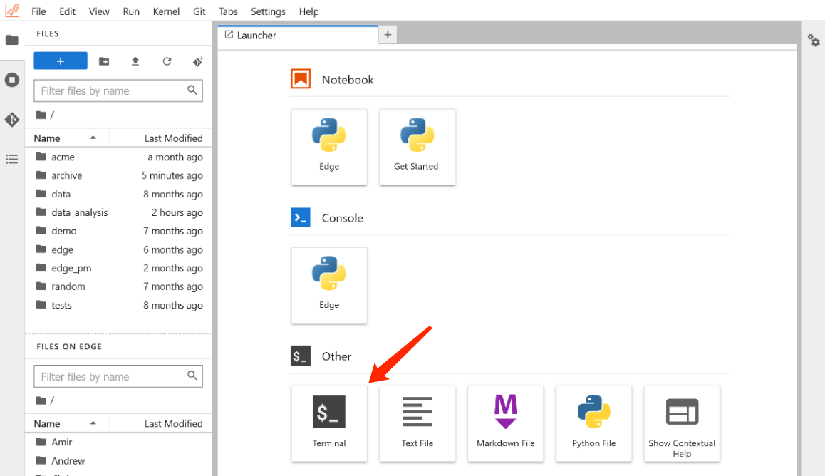 Open the terminal in the JupyterLab page. For remote development with other IDEs, refer to VSCode (recommended) and PyCharm.